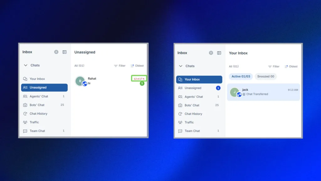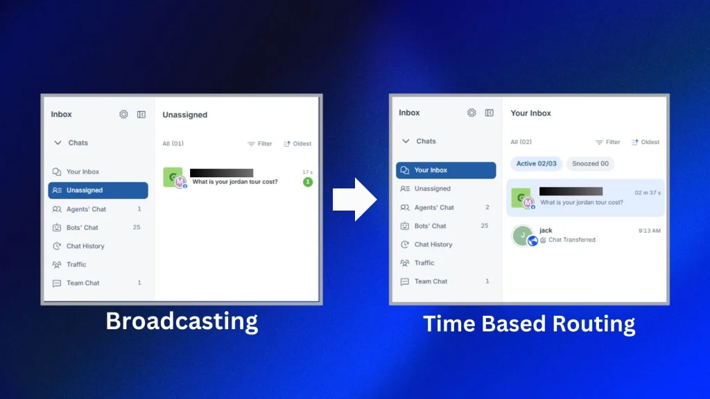 If “Broadcasting” is enabled, chat request will land on the unassigned folder. Users (agent & admin) have to pick it from there within the chat queue time. Below the timer marked in blue is the chat queue timer on the image on the left. Agents have to click start chat within that time to initiate conversation.
