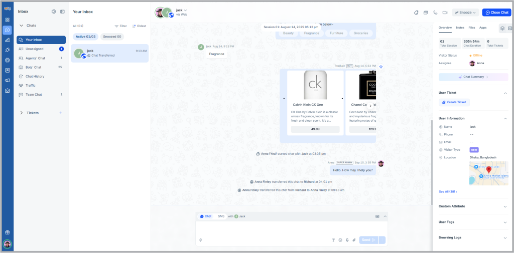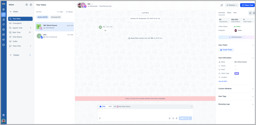Users can easily filter based on messenger chat request in the unassigned folder, making it easy to manage visitors inquiries. And after accepting the chat request, users (agent & admins) can reply to the visitors question. Please note that the chat window to message the visitor for 24hrs only (Meta rule). After assisting the visitor, users (agent/ admin) can close the chat.