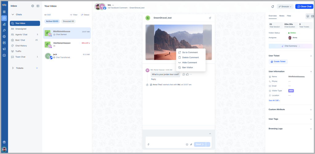 After accepting the chat request, users (agent & admins) can reply to the visitors comment. User can reply it as a comment or a private reply. Only after accepting the request, users can close the chat. Users can easily delete bad or sensitive comment from the inbox panel. Allowing users to maintain the Facebook page well.