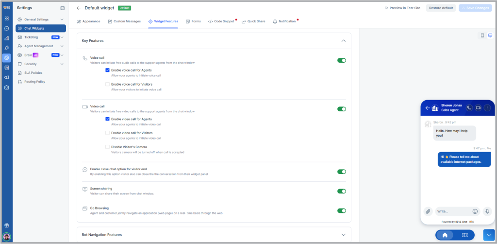 Step 1: In order to enable a co-browsing solution, you have to log in to your dashboard, go to settings -> chat widget -> select any of the available widget for which you want to enable cobrowsing -> Widget Features.
