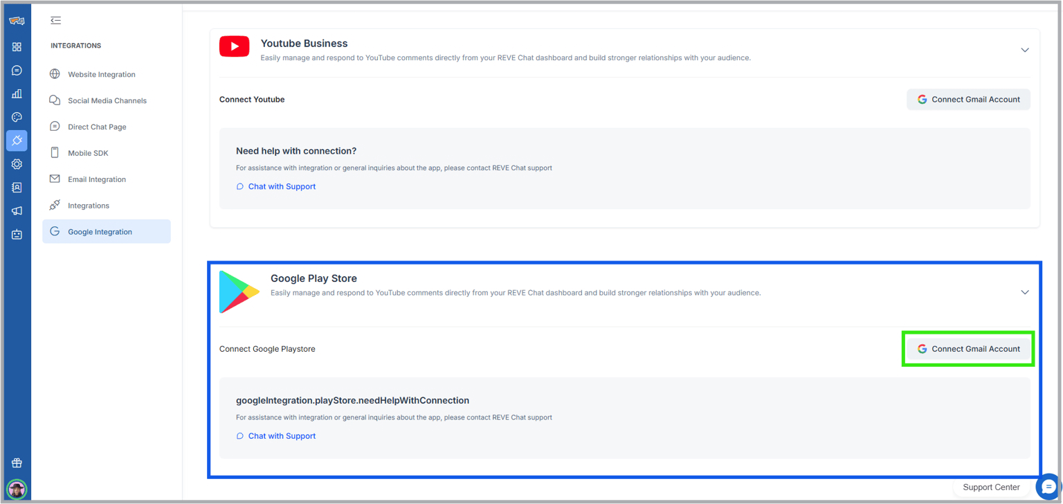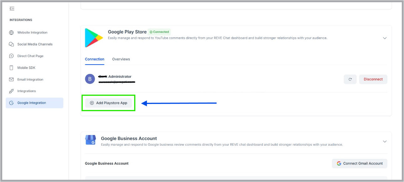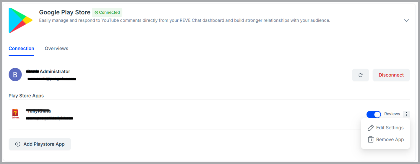 - After completing the google O-auth properly, user’s google play store account will be connected with REVE chat. Next, users need to add their published playstore application by clicking the “Add Playstore App” button.