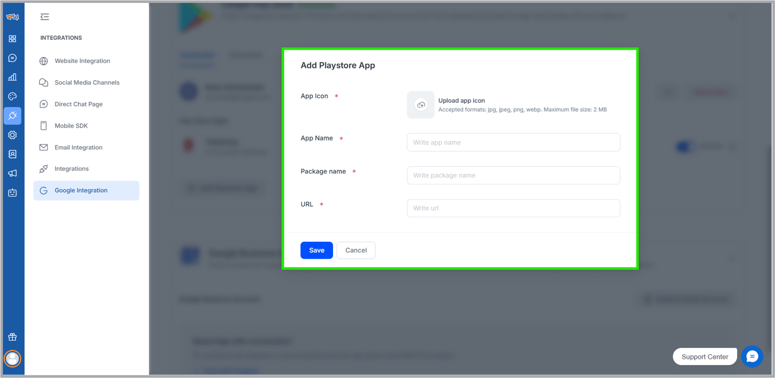 - By clicking the “Add Playstore App”, a new pop-up will appear. There We have to upload an icon of the app, provide the app’s name, app’s package name & lastly the playstore store URL. After providing all the info, click save.