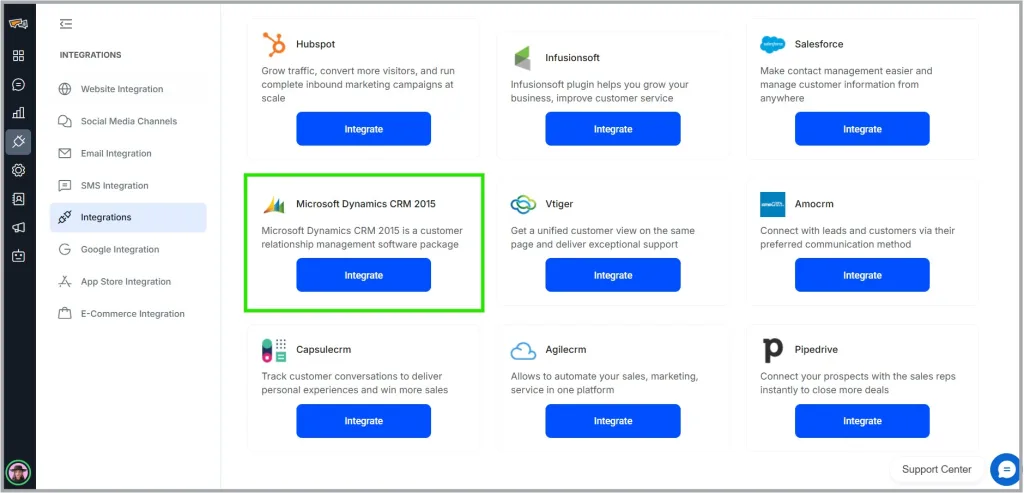 First go to the integration section and then click the ‘All Integrations’ and filter ‘CRM’. You will get Microsoft dynamics 2015 there.