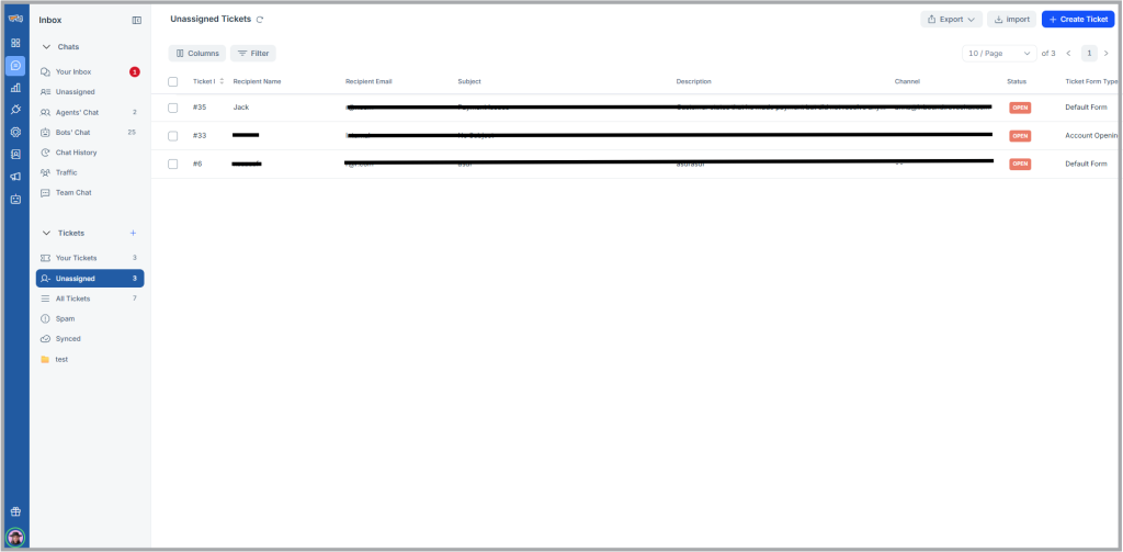 - Open: Tickets that are assigned to agent and status is Open. Here agents can, reply to customer on the solution, change ticket status to In Progress, change assignee and set priorities.