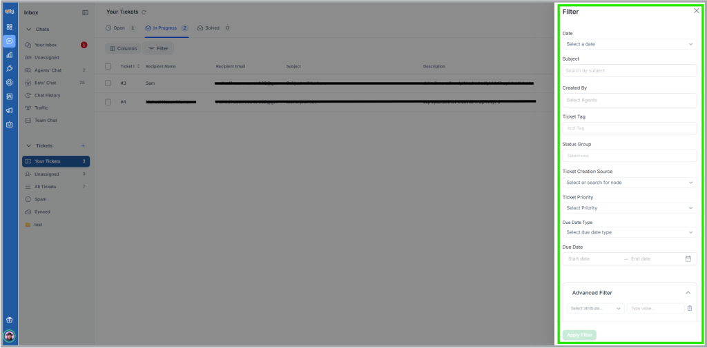 REVE Chat Tickets comes with advance filter, where you can filter tickets based on From-To date, Assignee, and Tags used for ticket. The advance filter allows you to change your search items from the table and show further data, no need to open the filter tab again and again.