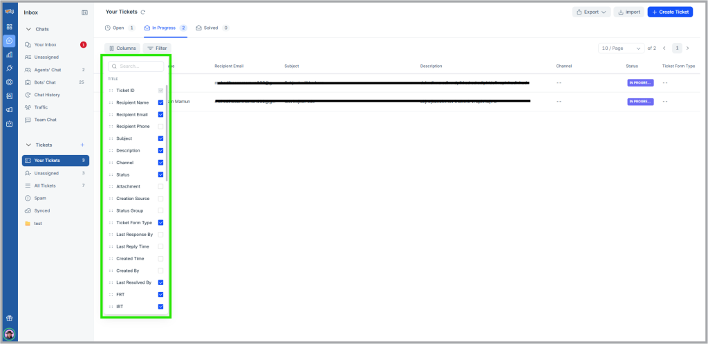 Tickets that are assigned to agent will be visible form here. If tickets are not assigned to person, that person will not see tickets in this table. This folder is divided into 3 sections Open, In progress, Solved.