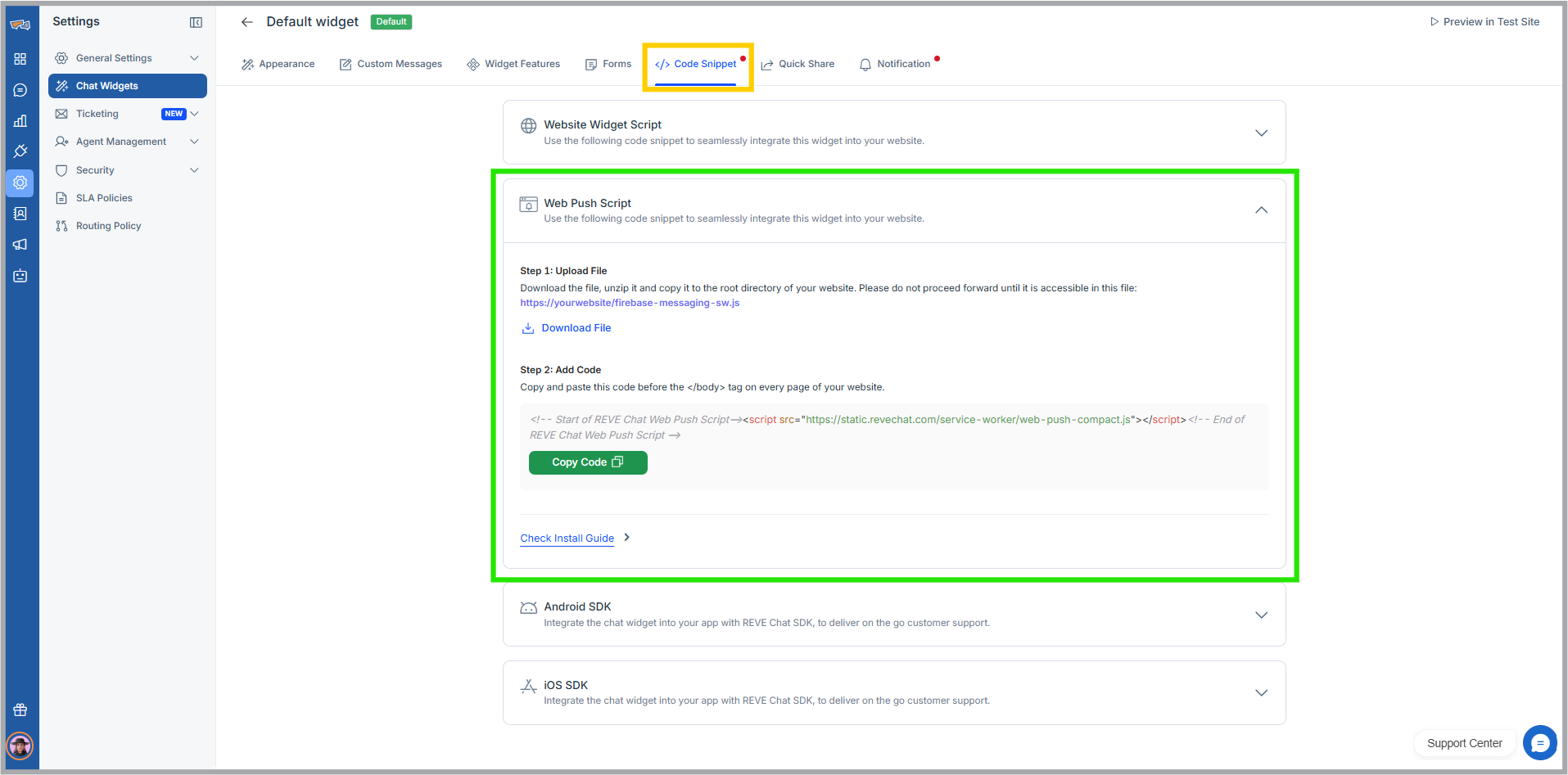 - Click a chat widget for which you want to enable the web push feature and navigate to the Code Snippet tab.