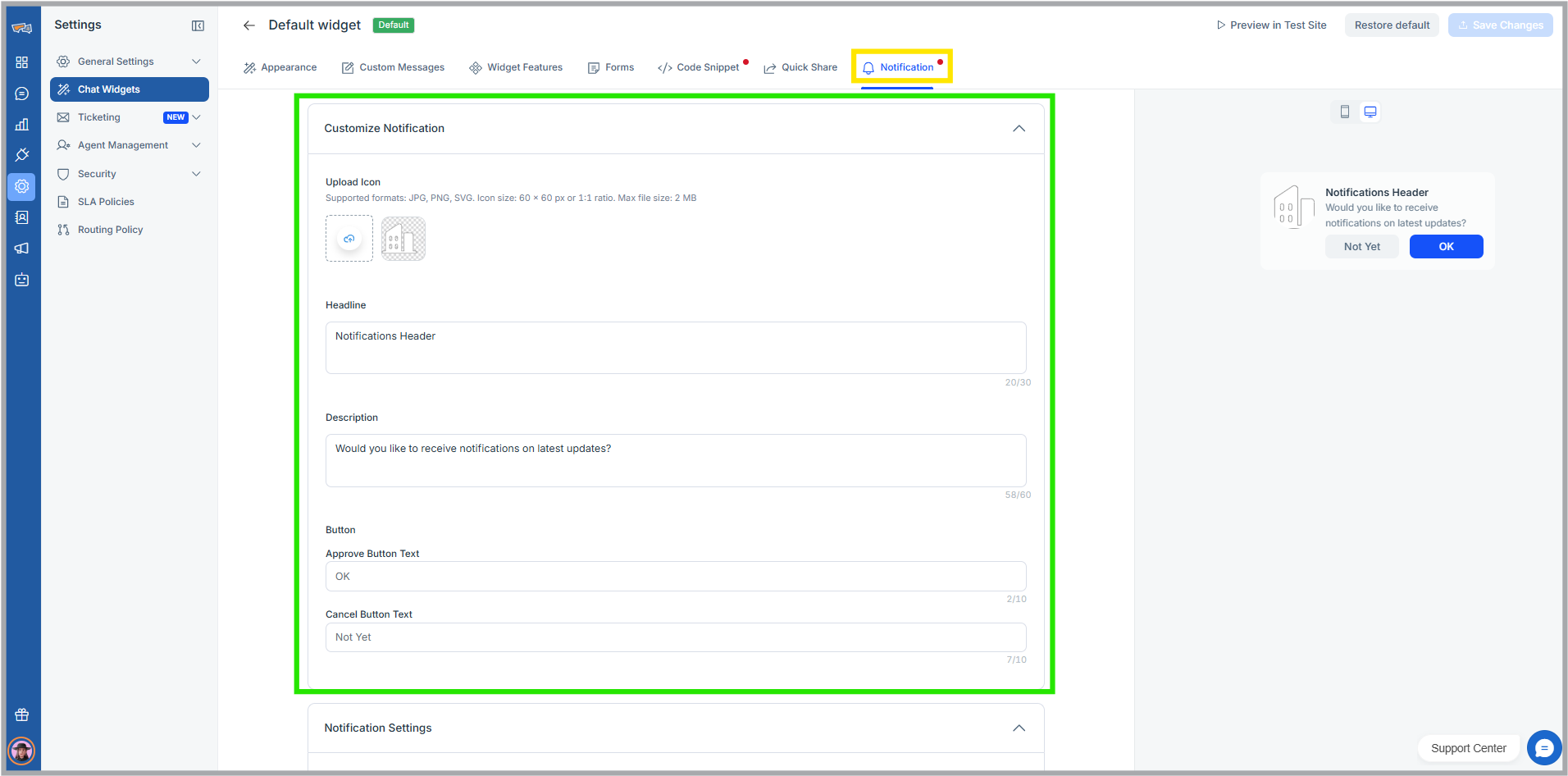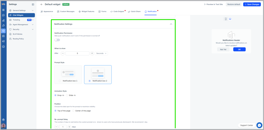 - Click a chat widget for which you want to enable the web push feature and navigate to the Notification tab.